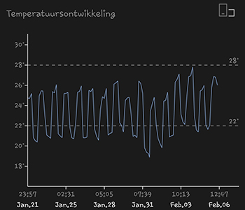 De 315 Watt CMH binnenzon hangt nog op dezelfde hoogte als twee weken terug. Het grote verschil is nu dat de dames onder de lamp wegzakken door de zwaarder wordende toppen. De gemiddelde temperatuur van de afgelopen 14 dagen was 22,94 graden Celsius. De gemiddelde luchtvochtigheid van die periode was 52,78 procent. De dip in temperatuur was van de overtrekkende storm. De wind stond vol op die zijde van het huis.