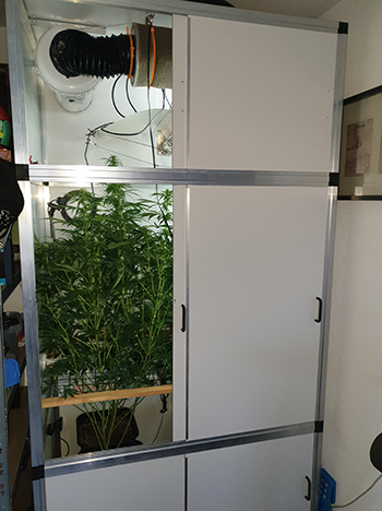 De Mohammeds groeien op het moment bijna de kast uit. Zelfs met de verhogingsset is de G-Kit XL nauwelijks hoog genoeg om deze dames te bedwingen. De Mohammed rechts vooraan heb ik een week geleden zelfs al iets in moeten korten, omdat de dame de lamp voorbij groeide. Ik had bij nader inzien iets eerder over moeten gaan op het bloeischema, dan waren de dames misschien wat minder gestrekt. Gelukkig heb ik wel het vermoeden dat ik het nét zal redden met de maximale hoogte van de lamp.