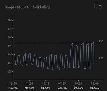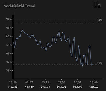 De gemiddelde temperatuur was de afgelopen twee weken 21,05 graden Celsius. De temperatuur is de laatste dagen erg aan het dalen, en ook daar kom ik straks op terug. Je ziet misschien ook een duidelijke stijging in temperatuur rond de 7e van december. De gemiddelde luchtvochtigheid was 57,94 procent. Deze is gelukkig weer aan het dalen.