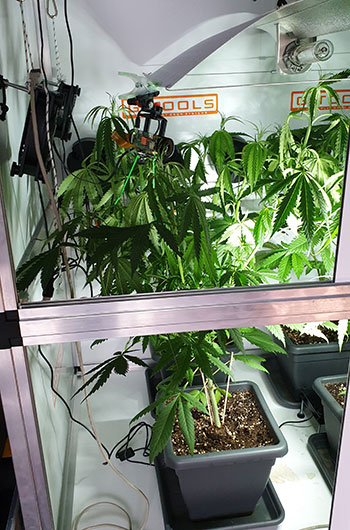 Vier dagen verder groeien de dames alweer bijna tegen de lamp aan. De vier Liberty Haze planten bedekken nu mooi het gehele kweekoppervlak in de kast. Hoe dit eruit ziet is goed te zien in met time lapse kweekvideo, onderaan dit artikel.