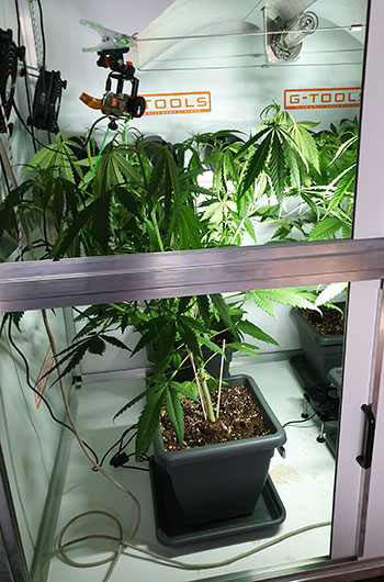 Hallo, Willie hier met een vers kweekverslag van de derde week op 12/12. Halverwege de week kwam ik erachter dat de Liberty Haze al bijna tegen de lamp aan zat. Nu kan ik de CMH lamp van de CNNBS G-Kit XL natuurlijk gewoon wat hoger optakelen, maar in plaats daarvan geef ik de dames weer een knipbeurt. Bij alle takken die te hoog zijn, knip ik de top net boven twee uitlopers weg. Eigenlijk top ik ze allemaal. Op de rechter foto hieronder, zie je dat de dames na het knippen weer even hoog zijn. Om alles goed in beeld te krijgen moet de binnenzon tóch iets omhoog.