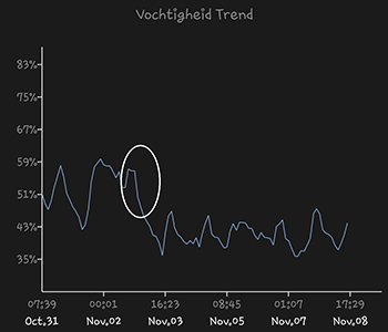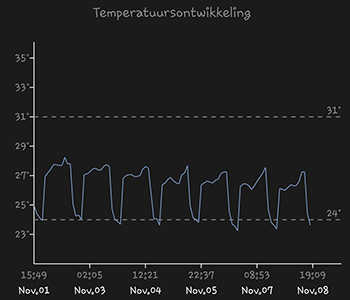 De gemiddelde temperatuur was de afgelopen week 25,55 graden Celsius, en dat is bijna gelijk aan vorige week, ondanks het goed ventileren van de kamer. De gemiddelde luchtvochtigheid is een heel ander verhaal. De dag dat ik het bakje heb weggehaald is direct zichtbaar in de grafiek. Het gemiddelde kwam daardoor ook uit op 41,35 procent. Deze week maar is kijken of ik een ander bakje heb wat erin kan want het werkt blijkbaar erg goed om wat extra vocht in de lucht te krijgen. Nu de verwarming weer aan staat is de lucht in huis ook droger geworden.