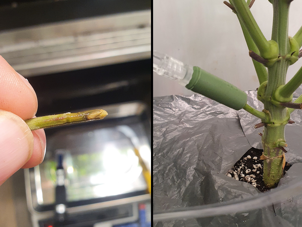 Toen ik hetzelfde maandag bij mijn eigen Somari (#3) zag, heb ik ook meteen gehandeld. Ik heb de afgestorven groeipunt van de tak afgesneden, en de adapter weer opnieuw aangesloten. Maar nu op het verse groene deel van de tak. Ik heb er wat foto’s met mijn telefoon van gemaakt.