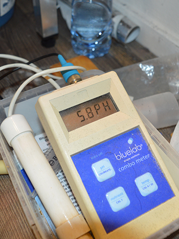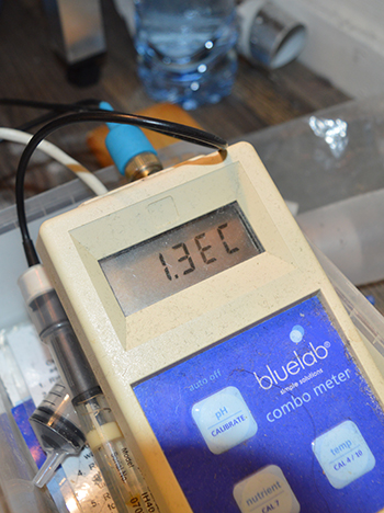 Tot slot heb ik natuurlijk even het water in het hydrosysteem gemeten. De poedervoeding van Druid doet zijn werk goed, moet ik zeggen. De pH-waarde stond na een week nog steeds netjes op 5,8 en de EC-waarde was gezakt naar 1,3. Deze voeding reguleert zelf de pH-waarde en er zit dan ook geen druppel pH-min of pH-plus in het water. Het is daarmee een heel gemakkelijke voeding om mee te werken. Zolang je het water met enige regelmaat ververst heb je geen pH-meter meer nodig, dus dat heb ik ook weer gedaan.