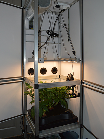 Nu de planten twee weken op 12/12 staan en de takken wat zijn uitgelopen, is goed te zien welke takken de bovenkant van het bladerdek niet zullen halen. Deze heb ik vanmorgen weggehaald. Eerder had ik ook al bij iedere plant de onderste twee zijtakken verwijderd, aangezien die het bladerdek eigenlijk nooit bereiken. Dit diefwerk dunt het geheel mooi uit en zorgt ervoor dat ik weer een beetje kan zien wat er onder in de kweekkast groeit. Ook stimuleert het de overgebleven takken om nog wat omhoog te klimmen.
