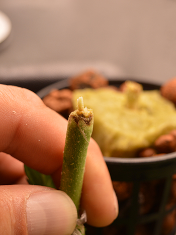 Bij nadere inspectie bleek het stammetje precies aan de basis rondom te zijn weggerot. Alleen de buitenkant van de stam was verrot en het plantje leefde nog maar ik moest helaas toch afscheid van haar nemen. Doorkweken met een plant waarvan de bast rondom is aangetast, zou een nare worsteling worden voor de plant. Ze zou het uiteindelijk niet redden omdat de sapstroom naar beneden was afgesloten.