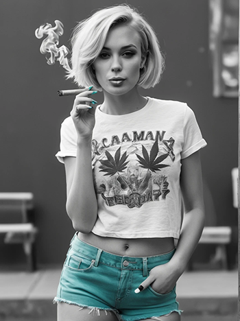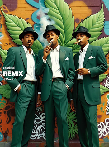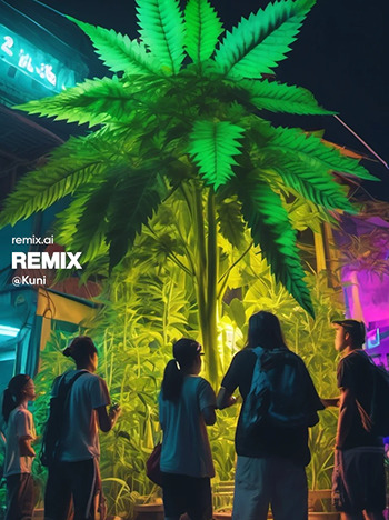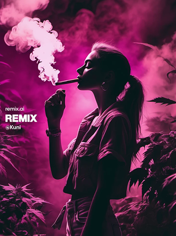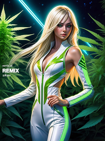 Nick, ook wel bekend onder de naam van zijn hondje Kuni had de smaak goed te pakken. Hij is aan de afbeeldingen te zien niet alleen fan van wiet maar ook van vrouwelijk schoon, wat natuurlijk ook een prima combinatie is. Hij stuurde ons maar liefst 15 prachtige cannabis afbeeldingen, die hij maakte met Remix AI op zijn telefoon. De prompts zijn daar schijnbaar ook te vinden, via het account @Kuni en voor gebruikers van de app.