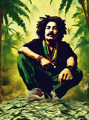 Ting Tong Tommy zoals die graag genoemd wordt, stuurde ons deze prachtige Midjourney creatie. De prompt die hij daarvoor gebruikte luidt: portrait of an old reggae singer, she is wearing cannabis buds as clothing, shoes are speakerboxes. Misschien lijkt de reggae zanger die de kunstmatige intelligentie maakte wel een beetje op Tin Tong Tommy’s grootmoeder want hij noemde het kunstwerk Cannabis Oma.