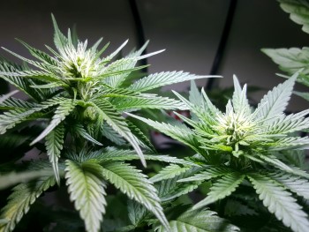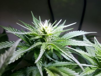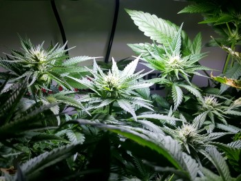 Gelukkig ook maar want de bloei is ondertussen goed en wel begonnen en ik knak liever geen toppen om. Om de topjes en de planten nu eens zonder het paarse LED licht te kunnen fotograferen, heb ik een spotje gekocht. Weliswaar ook met LED’s erin, maar dan wit van kleur. Daaronder zijn de dames een stuk fotogenieker. Qua meststoffen geef ik nog altijd helemaal niets, alleen schoon kraanwater. Voor de rest doen de plantjes het puur op de meststoffen die ze uit de Ultimate Soil van DNA en Mills. Om de dag geef ik ze ongeveer een halve liter te drinken. Vanaf nu zullen de toppen wekelijks groter worden, zodat het ook steeds leuker wordt in mijn kastje. Tot volgende week, dan zal ik jullie ook weer eens meenemen naar mijn autoflower-kweekproject.