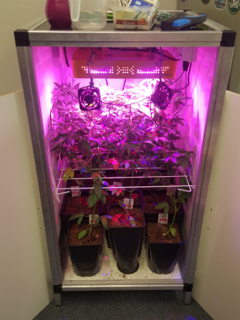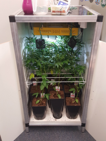 De planten van Dokter Groen zijn inmiddels eindelijk eens uitgegroeid en dragen al de nodige bescheiden topjes. Met andere woorden, het wordt nu echt leuk in zijn discrete LED-kweekkastje want de bloei kan beginnen. Licht uit, spot aan voor Dr. Groen.