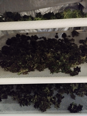 Terug naar de oogst: rond tien uur ’s avonds ben ik begonnen en tegen vijf uur ’s morgens was ik pas klaar 🙈😅🤣🤣 Over het knippen zelf kan ik je niet meer vermelden. Iedereen kent het minder oneindig durende gevoel wel van trim jail 🙈🤣 Maar het resultaat mag er zijn: zes netten zitten mooi vol en de grootste toppen heb ik met de hand geknipt en ondersteboven in de droogtent (met afzuiging en filter) gehangen. De droognetten staan hier uiteraard ook.