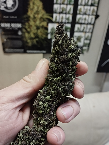 Het uitzicht is geweldig! Het zijn stuk voor stuk mooie dikke toppen. Ze zijn donkerpaars van kleur, en gaan bijna naar het zwarte toe. De geur is een typerende ‘purple’ geur als je je daarbij wat kunt voorstellen. Het is fruitig en als je een top openbreekt komt daar een fris aroma bij vrij; als een dennenbos met een hint citroen.