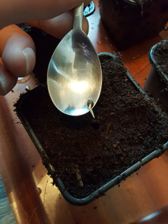 Prik met een satéstokje een gaatje in de aarde en stop het kiempje met het worteltje naar BENEDEN(!) in het gaatje. Het kiempje pak je gemakkelijk uit het koffiefilter met een theelepeltje. Zorg ervoor dat het worteltje geheel onder de grond is, maar het zaadje zelf nog nét te zien is. Druk de aarde rond het zaadje voorzichtig aan en maak het een beetje vochtig.