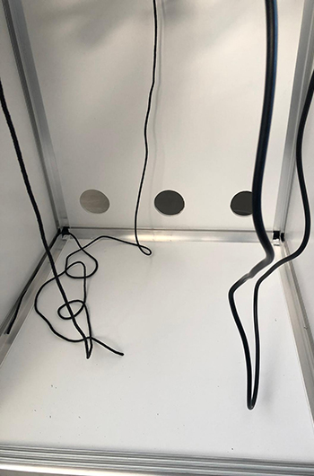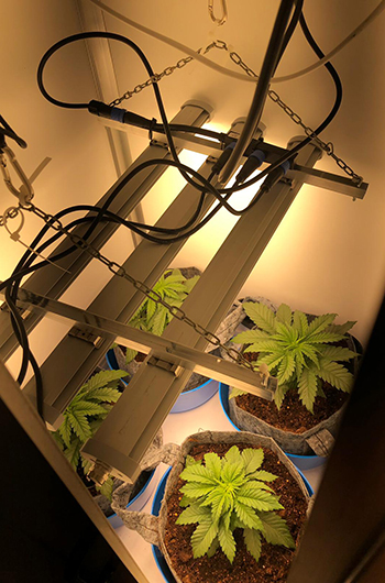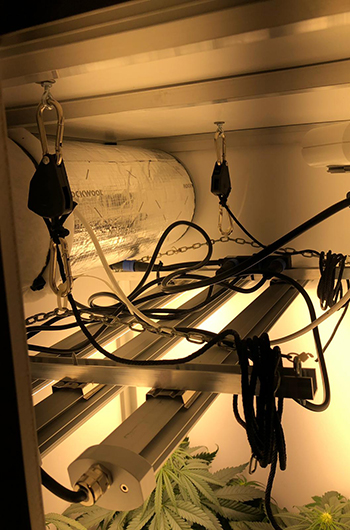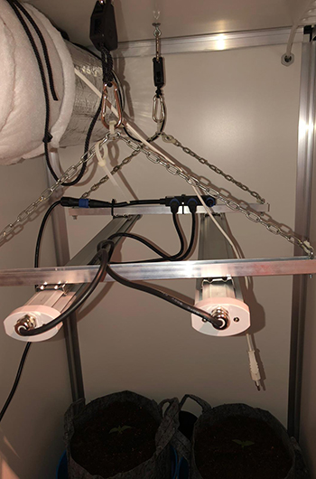 Vervolgens heb ik de led balken in de kast gehangen. Uiteindelijk zou ik met drie geschakelde led-balken kweken maar omdat er tijdens het transport een gesneuveld is, ben ik deze kweek met twee led balken begonnen. De led balken verbruiken 50 Watt per stuk en verspreiden een full spectrum wit licht. Dat werkt in de praktijk heel fijn omdat het de kleur van je bladeren niet vertekent zoals paars licht dat doet. Het witte licht maakt het ook makkelijker om (blad)problemen op te merken.