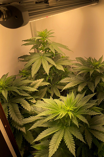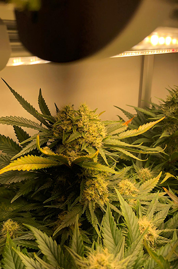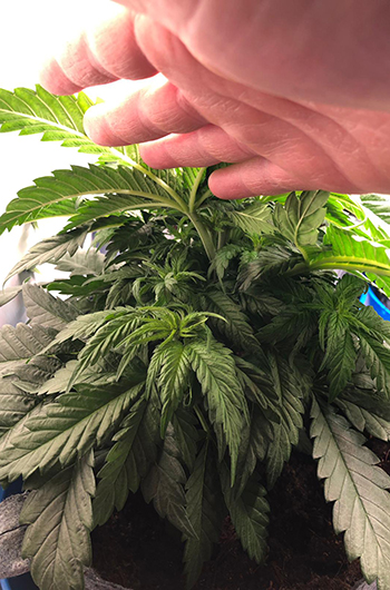 Ook heb ik meteen alle bladeren verwijderd die schaduw wierpen op andere toppen die we toch wel graag rijp zien worden. Ook de bladeren en topjes die kansloos onder aan de plant zitten hebben we verwijderd zodat het licht meer diepgang heeft en de luchtcirculatie in de kast verbetert. Zo krijgen we geen windstille zone waar vochtige lucht zich kan verzamelen en voor schimmel en rot kunnen gaan zorgen.