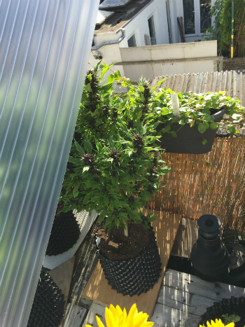 ‘De Duck leek het goed naar haar zin te hebben op mijn dakterras op het zuiden. Ze overleefde de regen en ik heb helemaal geen last van schimmel of wat dan ook gehad. De oogst was 240 gram droge en prachtige paarse toppen.’