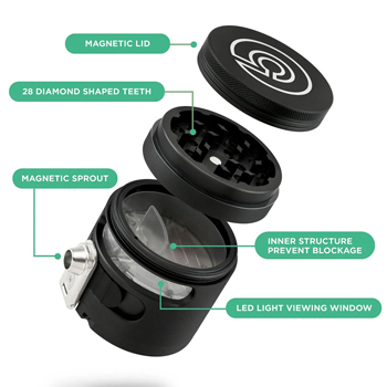 De grinder is namelijk gemaakt van geanodiseerd aluminium, en voorzien van diamantvormige en vlijmscherpe tanden die het malen vergemakkelijken. De textuur op de draaischijf van de grinder zorgt daarbij voor een perfecte grip. Dankzij een raampje aan de zijkant en een LED lampje kun je heel nauwkeurig doseren, terwijl het ingebouwde motortje een gelijkmatige stroom wiet in je vloeitje dropt. En dat ziet er dan als volgt uit: