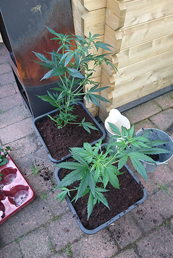 13 mei: Het is bijna IJsheiligen en het weer is schitterend; ik moest bij familie zijn alwaar ik ook vijf plantjes in de hoek van de tuin mag zetten, in één 90 en twee 65 liter kuipen. Ik besluit er twee Green Poison Haze en drie Mighty Strawberry Kush neer te zetten. Als grondmengsel gebruik oude binnen-potgrond, verse potgrond en tuinturf.