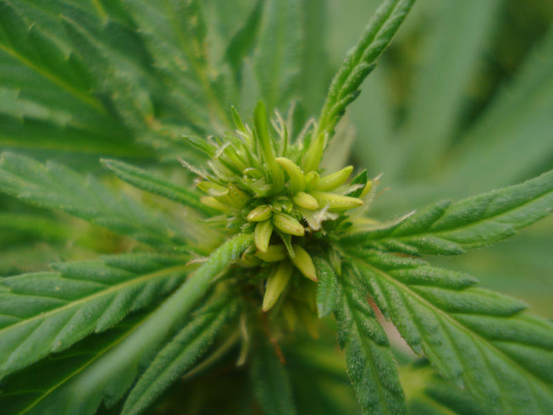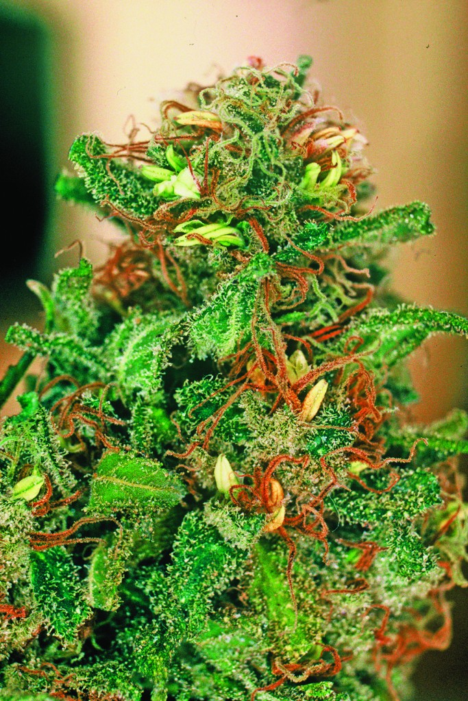 Let, vooral als je met gefeminiseerd zaad werkt, in de bloeifase goed op eventuele mannelijke bloei in de toppen. Herma’s kunnen er op twee manieren uitzien: ze kunnen mannelijke takken hebben, of een enkel mannelijk bloempje tussen de toppen. Vooral dit laatste kun je gemakkelijk over het hoofd zien. Let er goed op of er niet ergens een soort banaanvormig bloempje groeit en verwijder hem direct voordat ie open gaat en je toppen bezwangert! Voor de zekerheid moet je wellicht de hele top verwijderen, aangezien een enkele mannelijke bloem je hele oogst kan verpesten.