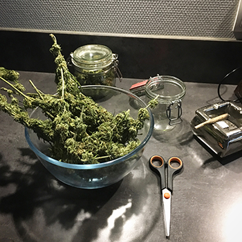 De planten heb ik ontdaan van de grote bladeren en in hun geheel ondersteboven opgehangen in een droogtent. Tien dagen later waren ze droog genoeg om te worden geknipt; het minst leuke klusje van het hele buitenkweken.