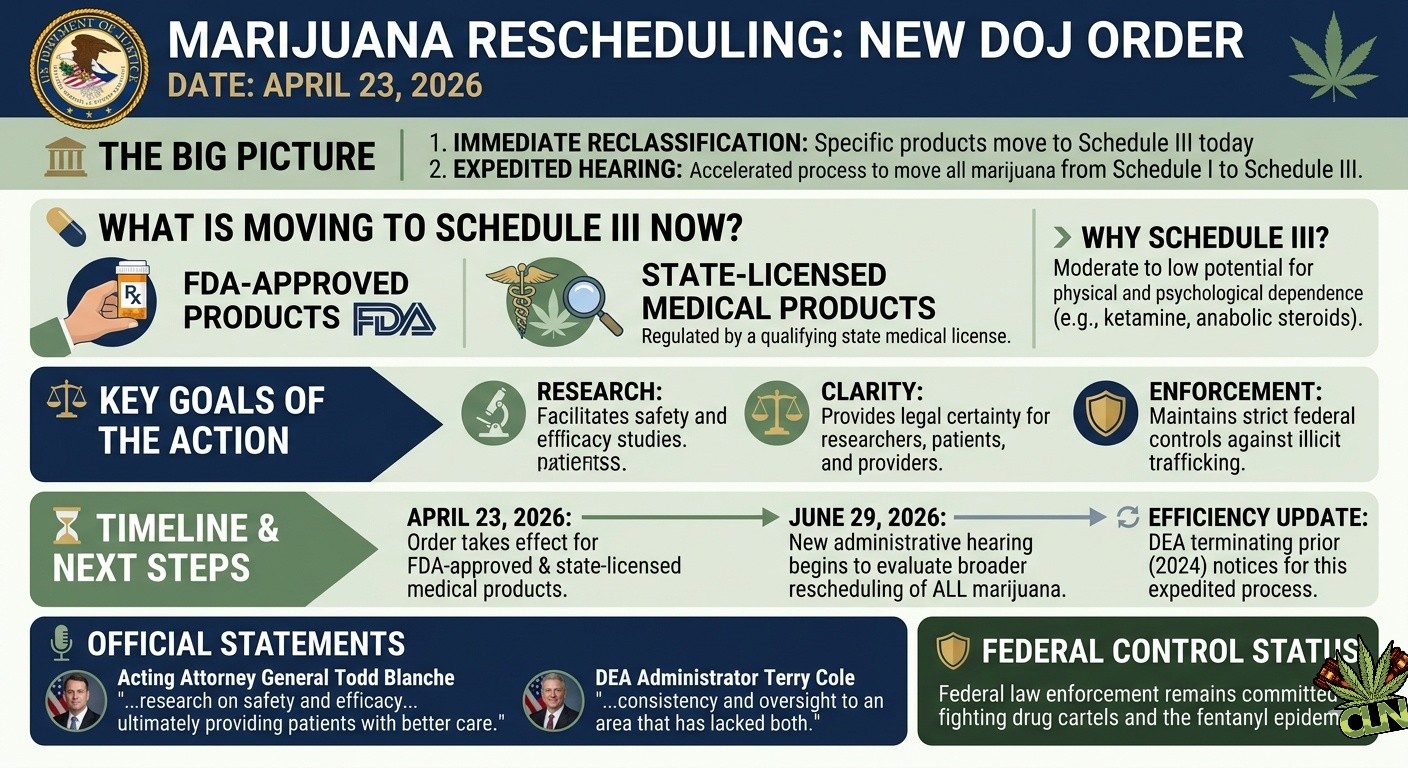 Waarnemend Minister van Justitie Todd Blanche heeft donderdag de classificatie gewijzigd van producten die cannabis bevatten en die onder toezicht staan van de Food and Drug Administration (FDA) of een medische marihuana-vergunning van een staat hebben gekregen.