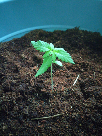 Kijk, de pot is naar verhouding veel te groot voor deze kleine zaailing. Ik weet wel dat er vaak wordt aangeraden om autoflowers niet te verpotten, waarschijnlijk de reden waarom je deze direct in de eindpot hebt gezet. Toch is het mijns inziens beter om wel eerst een klein potje te gebruiken. Deze is beter in verhouding met het formaat van een zaailing.