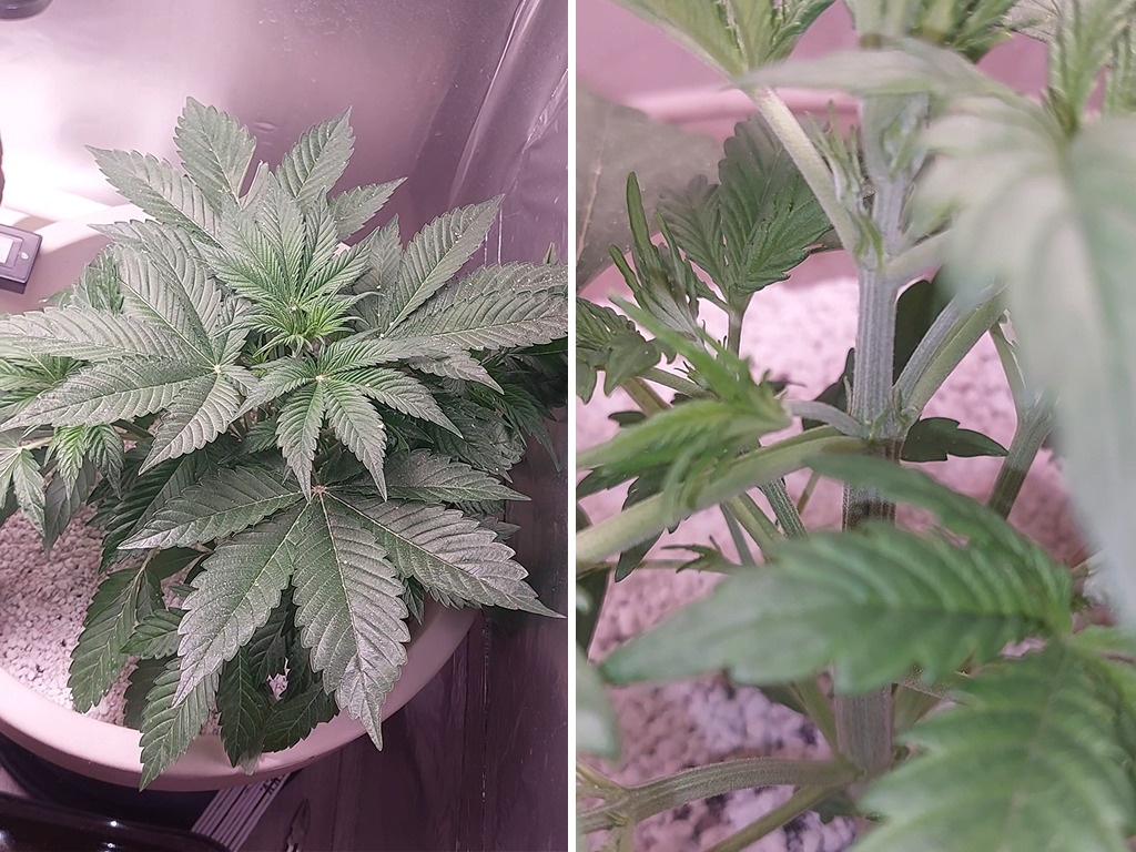 Verwacht in de overgang naar de bloeifase dat deze wietplant nog zeker drie keer zo groot wordt. Ik zie nog een paar grote schutbladeren zitten, die nieuwe zijtakken bedekken. Als ik je een tip mag geven, raad ik je aan om die schutbladeren even weg te halen en de plant te toppen. De zijtakken zullen dan veel sneller groeien dan ze nu doen. En dat is belangrijk, want aan elke tak groeit straks heerlijke Sherbet Queen wiet.