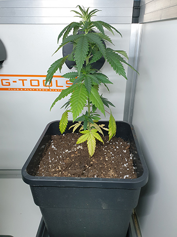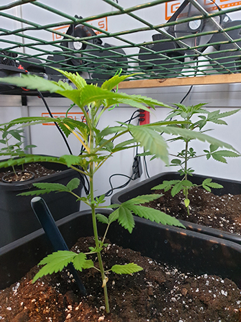 Als we de dames van wat dichterbij bekijken zien we dat het bovenste deel veel meer bladeren vormt en kortere internodes. Ook dat is een reactie op het wisselen van de lichtbron. De dames hebben een gemiddelde hoogte van 34 centimeter en dus is het al bijna tijd om ook hier het hekwerk te plaatsen. De dames hebben de hoogte bijna bereikt. De G-Bars hangt op een hoogte van 18 centimeter boven de dames. De bewatering van de dames gebeurt dagelijks en ze krijgen dan 250 milliliter water met voeding.