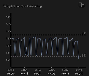 De eerste klimaatgegevens van deze kweekronde zijn binnen. De gemiddelde temperatuur was de afgelopen 14 dagen 25,29 graden Celsius. De temperatuur was stabiel op één dag na maar dat kwam omdat ik de ramen wilde lappen. Dan moet het raam even open en komt de kou snel naar binnen.