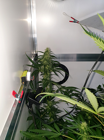 In de kleine G-Kit (met verhogingsset) staat het propvol met Sneeze. De planten drukken de deur bijna open! Het verschil tussen de twee is eigenlijk niet meer te zien. Ze zijn door elkaar heen gegroeid en zoeken naar het laatste vrije stukje kast waar ze verder kunnen groeien. In vergelijking met de Jack Herer ruikt de Sneeze ook al een stuk sterker. Als ik de deur open heb gehad moet de kamerdeur zeker een half uur dicht blijven, zodat de lucht gefilterd kan worden en niet meer ruikt.