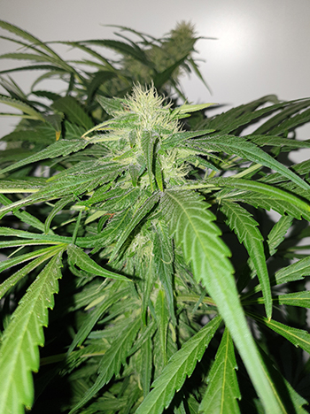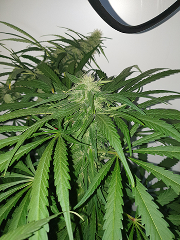 De hoofdtop van de Jack Herer die recht achter de mannelijke plant stond lijkt iets voor te lopen op de rest. Deze dame is de kleinste van het trio, maar heeft op dit moment dus wel de dikste hoofdtop. Ik ben alleen een beetje bang dat deze straks vol met zaadjes zit…