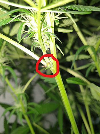 Toen ik de dikke stam aan het inspecteren was om te kijken of ik iets kon bedenken om deze te buigen, kwam ik iets raars tegen op één van de zijtakken. Daar zat een calyx als ik het goed heb, die er anders uitzag dan normaal. Normaal zijn ze rond deze tijd gewoon groen met twee witte uitstekende voelsprieten. Nou ja, dat zijn geen voelsprieten natuurlijk maar bloeiharen. Deze bloeiharen vangen stuifmeel van de mannelijke planten op, en maken er daarna een zaadje van.