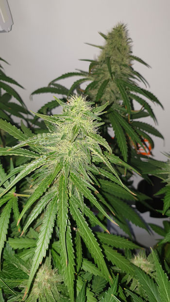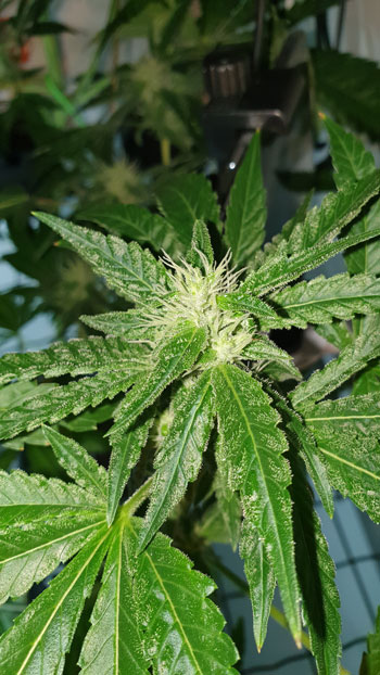 Deze drie planten hebben ondertussen al behoorlijke bloemtrossen. Van de drie dames heeft er één wat bruine bladeren en dat is de top die het dichtst bij de lamp groeit. Waarschijnlijk hebben de bladeren het te heet gehad en zijn ze hierdoor verdord. De toppen kleuren verder al aardig wit door de trichomen. Ik zal ze straks van dichterbij laten zien met behulp van de microscoop, nu eerst over naar de Critical Orange Punch.