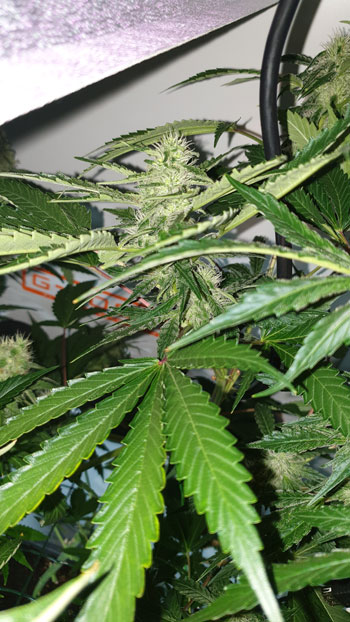 Bij de Morning Glory’s staat het al aardig vol en zijn ze volledig transparant. Dit betekent dat de trichomen goed in ontwikkeling zijn maar nog niet rijp genoeg zijn om te oogsten. De Critical Orange Punch zit ook al goed vol. De trichomen lijken hier wit te zijn maar dat is de weerkaatsing van een lamp in de kamer. Nog niet helemaal rijp dus. Bij de AK Choco Kush is het blad een stuk minder goed bedekt. Deze plant is ook wat later in bloei gegaan. Voor de White Choco Haze geldt hetzelfde als voor de AK Choco Kush: de dames zijn weekje jonger en minder bedekt met trichomen.