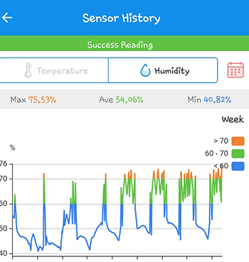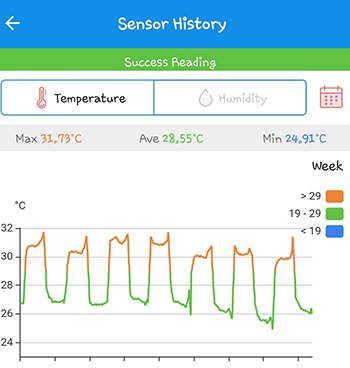 Het klimaat in de CNNBS G-Kit XL is weer aan het stabiliseren, en dit zien we natuurlijk ook terug in de statistieken. De gemiddelde temperatuur was 28.55 graden Celsius en is dalende. De gemiddelde luchtvochtigheid is met 54.06 procent lager dan ik had gewild. Dat heeft natuurlijk ook met de hoge temperatuur te maken; zodra de temperatuur boven de 27 graden komt, schakelt de afzuiger in werking. Dit heeft ervoor gezorgd dat de luchtvochtigheid erg laag was afgelopen week. In de grafiek is duidelijk de daling van temperatuur te zien, en tegelijkertijd een stijging van de luchtvochtigheid.