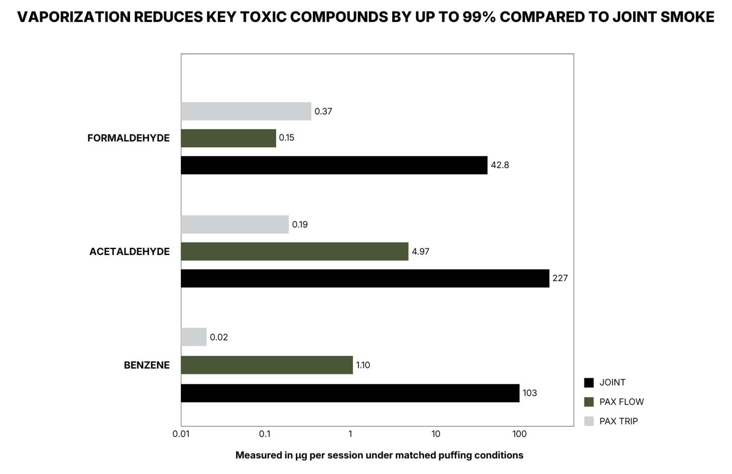 “De verbranding van cannabis-plantmateriaal produceert een complexe aerosol die talrijke schadelijke bijproducten bevat, gevormd door pyrolyse en oxidatie. Onder vergelijkbare inhalatie-omstandigheden verminderde verdamping van cannabisbloemen de blootstelling aan deze schadelijke stoffen met maar liefst 99% in vergelijking met de rook van een joint.”