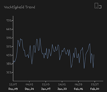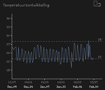 De gegevens starten zo’n drie weken voor aanvang van de bloeiperiode. De tijd daarvoor is toch iets minder interessant en maakt de grafiek zo groot. De 315 Watt CMH binnenzon heeft de hele tijd zo’n 25 tot 30 centimeter boven de dames gehangen. Het lichtschema in deze periode was 12 uur aan en 12 uur uit. De gemiddelde temperatuur van deze kweekronde was 22,49 graden Celsius. De gemiddelde luchtvochtigheid in deze periode was 50,94 procent. Ik moet zeggen dat dat helemaal geen verkeerd klimaat is.