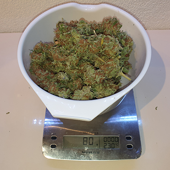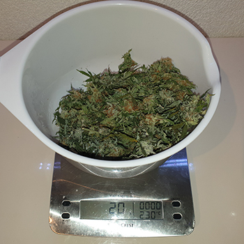 Ik heb de wiet voor het wegen een beetje gesorteerd op kwaliteit. De eerste bak was gevuld met kleine topjes. Mooi spul voor in een cake maar niet echt topkwaliteit om te roken, en dat was 20 gram. Het tweede weegmoment was voor de Sneeze links achterin, die met de dubbele top. Dat was 80 gram. De derde plant op de weegschaal was die linksvoor stond. Deze was voor het grootste gedeelte omgevallen, maar ook die leverde 80 gram op.