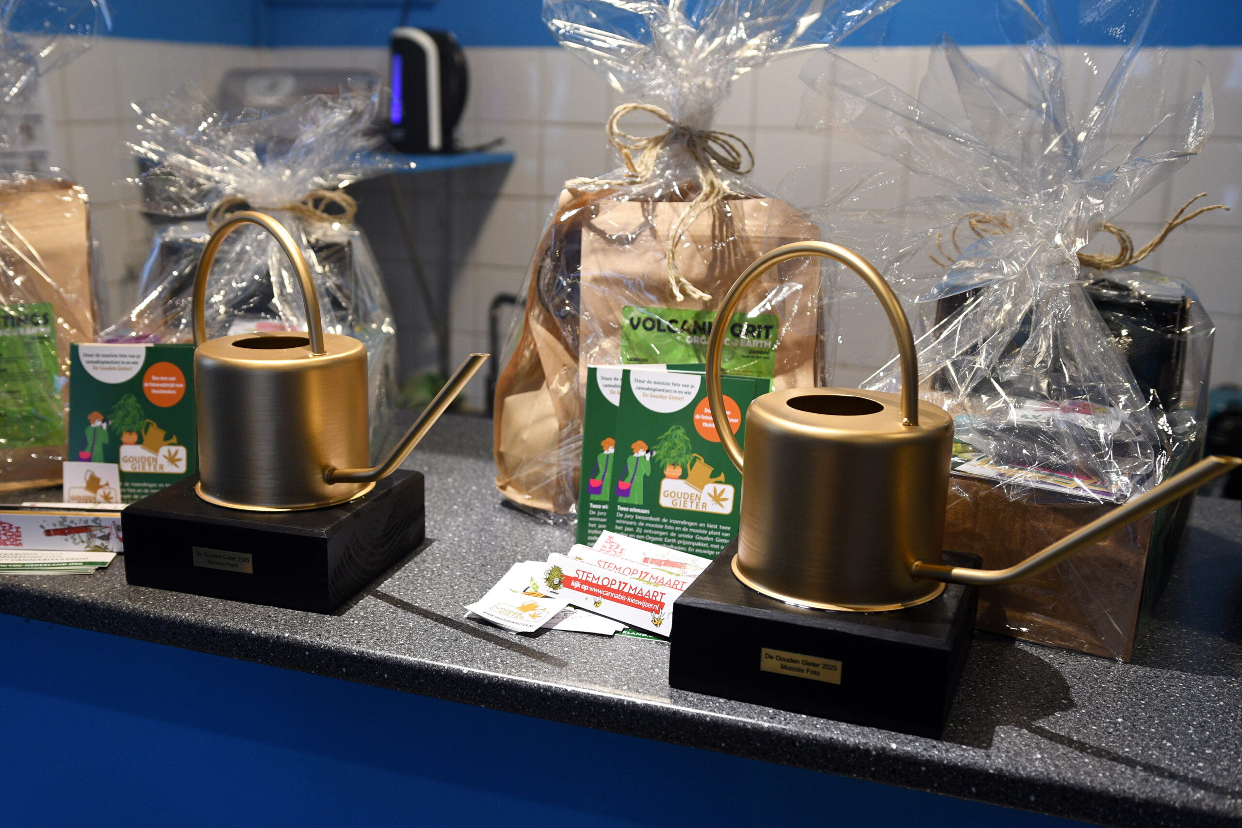 De beide winnaars ontvangen naast een met de hand gemaakte Gouden Gieter trofee een goedgevuld prijzenpakket, samengesteld en aangeboden door Organic Earth.