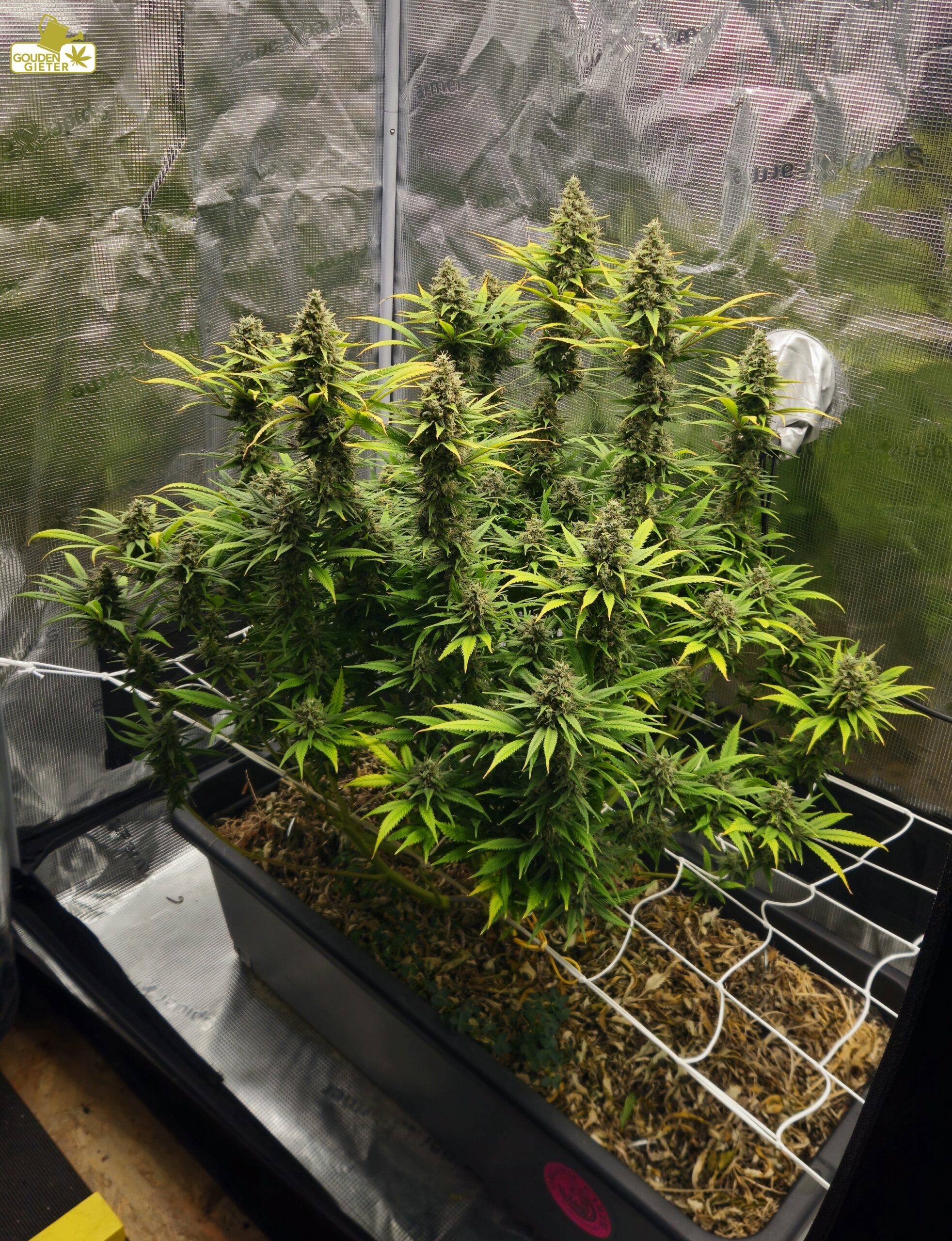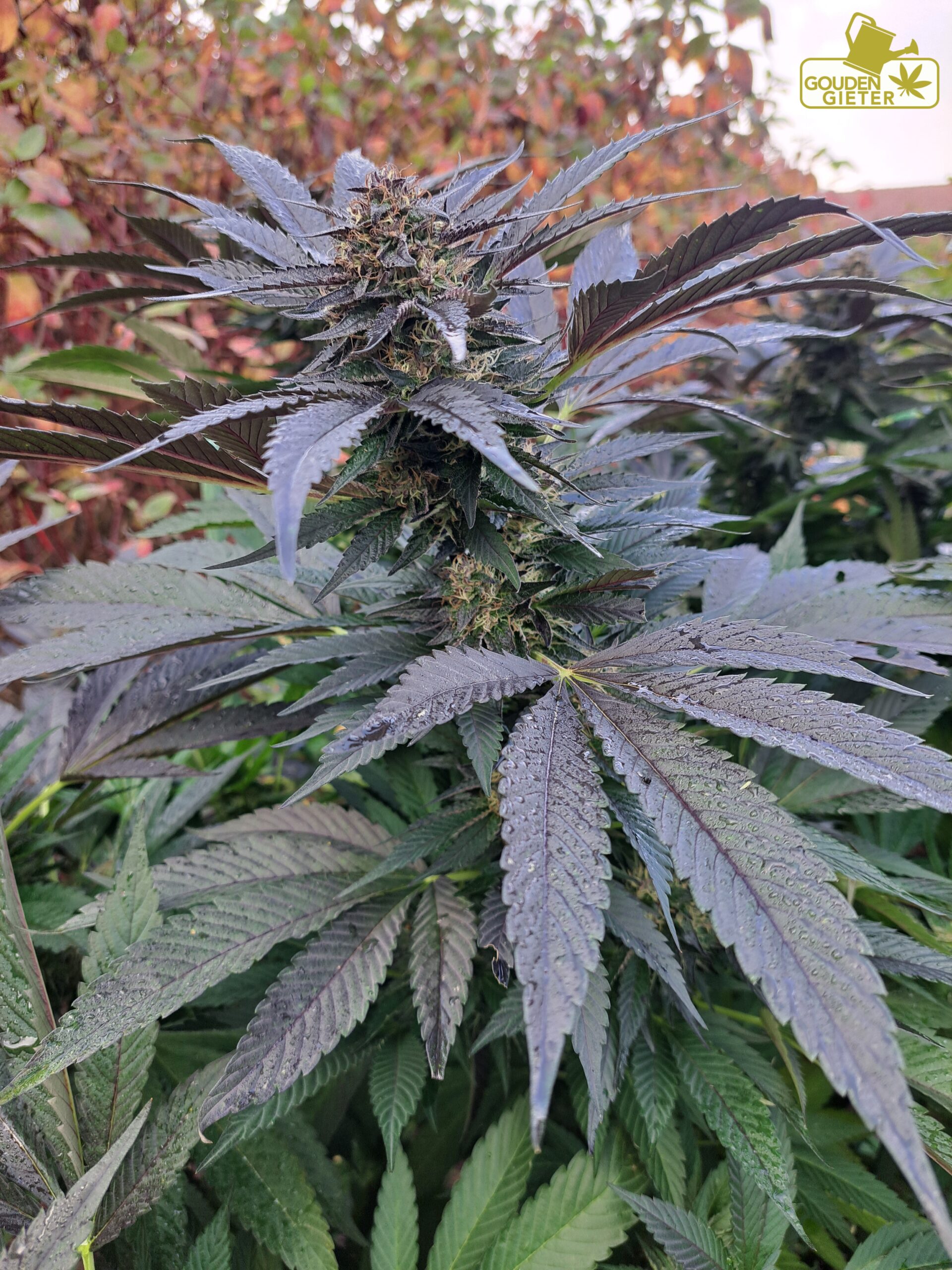 ‘Je ziet dat deze plant gekweekt is door een liefhebber en de ruimte heeft gekregen. In die grote pot heeft ze een flink wortelstelsel aangemaakt. Naar alle waarschijnlijkheid biologisch gekweekt. De onderste bladeren en kleine frutsels zijn verwijderd en dat levert veel mooie dikke bloemen op. De meststoffen zijn tot het einde gebruikt en bladeren beginnen lichter te kleuren; dan zullen de buds lekker ruiken en vol zitten met terpenen en flavonoïden. Dit zal een smaakvol bloemetje opleveren.’