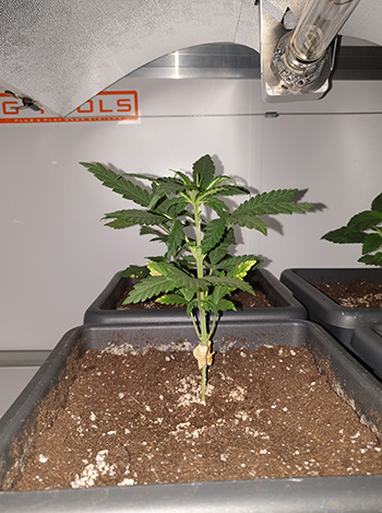 De kleine wietplantjes zijn geheel hersteld na de verhuizing, dus laten we is een kijkje nemen in de kweekkast. Ik ga van start met de Critical Orange Punch. Dit is met een hoogte van 18 centimeter het grootste plantje in de kast; ze staat er netjes bij.