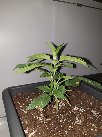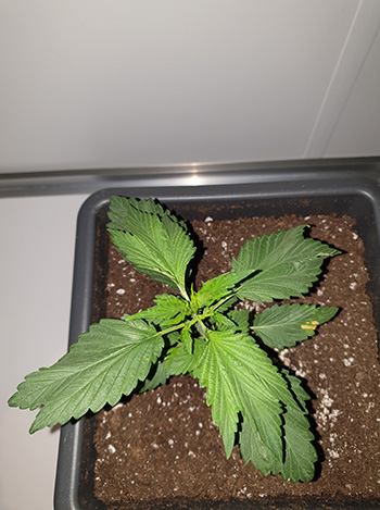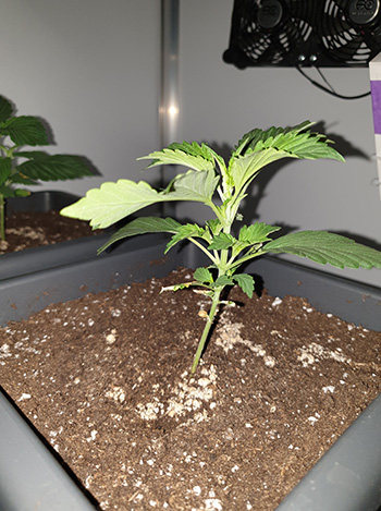 De drie andere planten die ik in de kast heb, zijn Frisian Ducks. De eerste van de drie krijgt haar eerste typische Duckfoot-blad, dat er dus ook totaal niet uitziet als een wietblad. Het plantje heeft een hoogte van 16 centimeter.