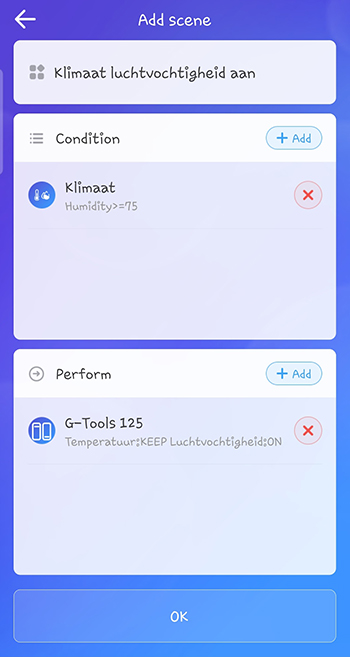 De Sonoff Dual Channel die maar één apparaat kan aansturen, wat schiet je hiermee op? Het is nu mogelijk om de temperatuur te schakelen (schakelaar 1) en de luchtvochtigheid (schakelaar 2). Kijk maar even mee in de ‘Scene’ van de bijbehorende app EWeLink.