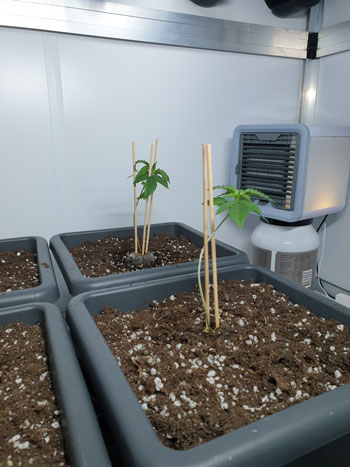 De Arctic Air koeler heb ik ook maar weer even in de kast gezet, om de luchtvochtigheid in wat omhoog te schroeven. Of dat gelukt is, lees je zo in het weerbericht. Omdat de zaailingen vorige week zo snel groeiden in de Plagron Seedbox zijn ze nu niet sterk genoeg om rechtop te staan. Dat zal de komende week wel goed komen maar voorlopig worden ze daarom nog ondersteund met satéstokjes.