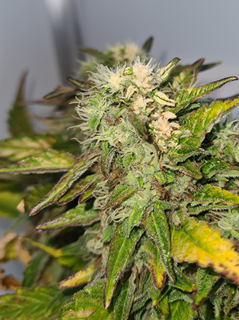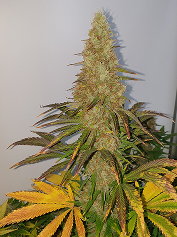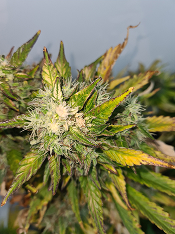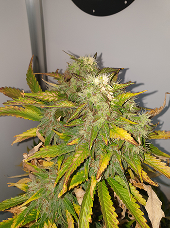 In de eerste week na mijn laatste verslag (bloeiweek #7) ging het goed. De dames dronken goed. Ze vergeelden langzaam, werden steeds zwaarder en sommige toppen zijn door hun gewicht zelfs omgevallen. In de week daarna ging het ineens heel snel. Het was maandag en de Sneeze links achterin (die met de dubbele top) kreeg licht gekleurde uitlopers.