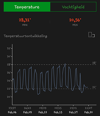 De 315 Watt CMH binnenzon heb ik niet verhangen en heeft ook in de laatste weken nog steeds op dezelfde hoogte gehangen (25 centimeter boven de toppen, red.). De gemiddelde temperatuur van de afgelopen veertien dagen was 22,95 graden Celsius. De gemiddelde luchtvochtigheid was daarbij 51,68 procent. De bewatering van de dames bestond uit water zonder toevoegingen, en was gemiddeld 650 milliliter per plant.