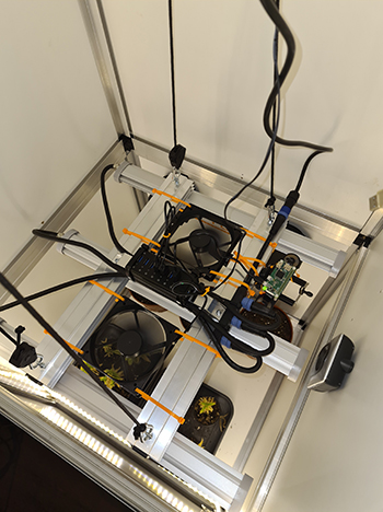 Ik heb twee 120 millimeter ventilatoren en de raspberry pi zero camera op de lamp gemonteerd. Dit is niet nodig en zal de lamp niet beter doen presteren maar nu staat het niet meer op de bodem en hangen er geen kabels meer in de weg bij het maken van foto’s. Ik heb de USB-hub er ook opgezet om de ventilatoren en camera van stroom te voorzien. De hub krijgt stroom van de accu’s van de zonnepanelen.