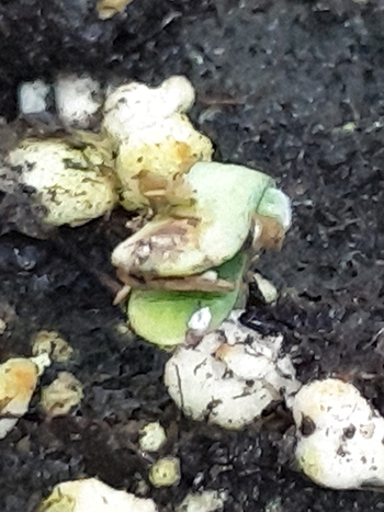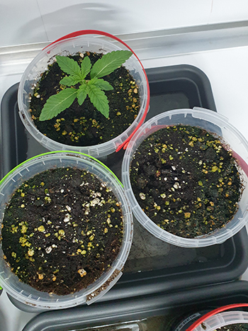 En als laatste heb ik hier de twee White Choco Haze waarvan er één boven de grond is gekomen. Er ís dus nog hoop voor de rest. Ik heb het kleine plantje niet opgemeten maar denk wel zeker 4 millimeter! 🙂
