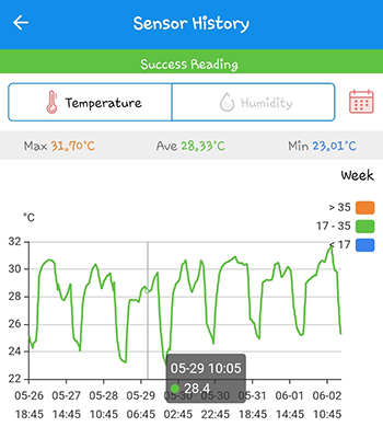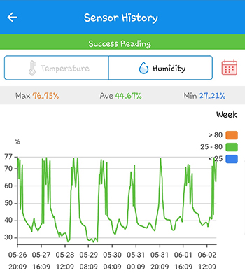 Op het linker screenshot hieronder is een overzicht van de temperatuur te zien. Hierin zie je duidelijk dat het mogelijk is om de ruimte te koelen terwijl de lamp aan staat. Maar de watertank van de Arctic Air is te klein en is, als de lamp aan staat, na 4 uur leeg. Als de lamp uitgaat doet hij goed zijn werk. Dit is te zien in het tweede screenshot van de luchtvochtigheid. Hij zorgt ervoor dat de plantjes een lekker koele en vochtige nacht hebben. Het nadeel is wel dat ik hem elke dag moet vullen en aan moet zetten als de lamp uit is gegaan.
