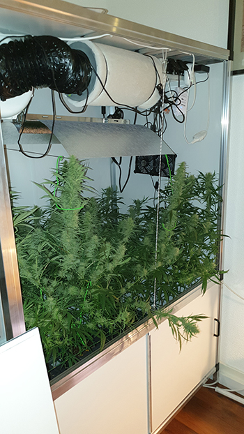 Zoals je kunt zien staat echt de hele kast vol met kleverige witte toppen. Ja, de dames plakken al aardig. Om de planten goed te bekijken heb ik de deuren eens uit de CNNBS G-Kit XL gehaald. Omdat zo’n beetje iedere plant inmiddels topzwaar is, vielen de toppen daarbij letterlijk de kast uit!
